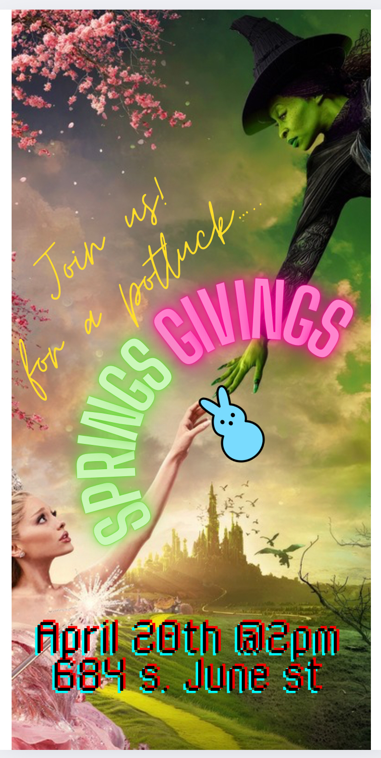 Join us for our annual SpringsGiving Potluck Party, on April 20th from 2pm until late at night. People arrive throughout the day and evening, but egg hunt begins at 4:30.